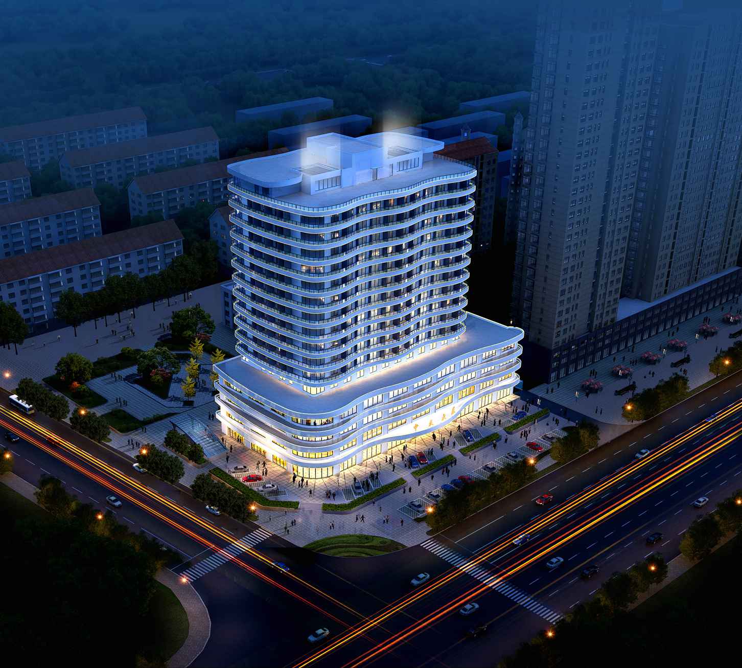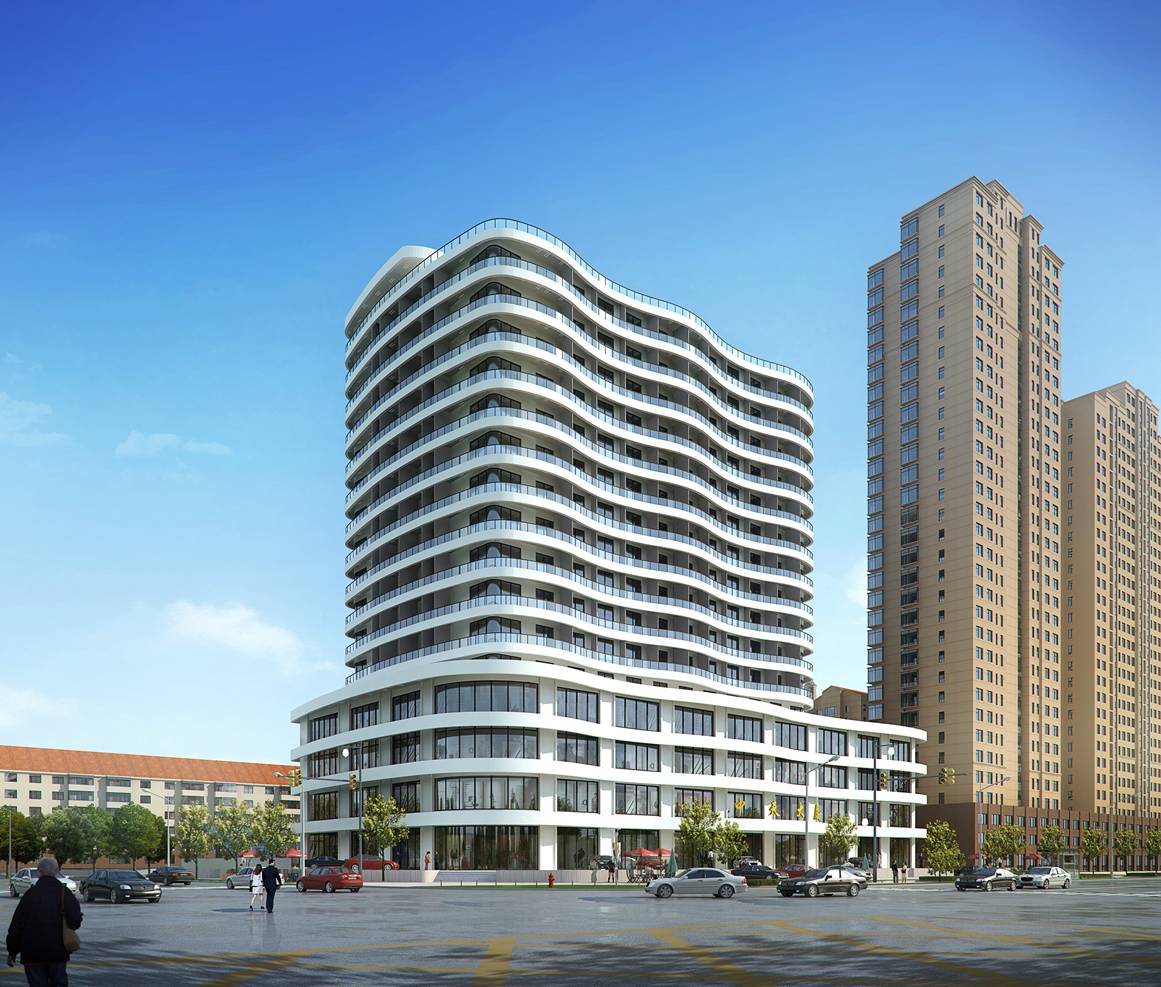 在建筑表現(xiàn)形式上,采用現(xiàn)代建筑風(fēng)格,建筑立面結(jié)合營口作為海濱城市特點(diǎn),利用框架剪力墻結(jié)構(gòu)的支撐,每一層都包裹上鋼筋混凝土懸臂弧形陽臺(tái),借用曲邊陽臺(tái)前后進(jìn)出起伏的變化,營造出近似水紋波浪的建筑表現(xiàn)。采用高檔外墻飾面層,通過精雕細(xì)刻的施工工藝,呈現(xiàn)出精致美觀的城市建筑,完善城市的天際線,豐富城市的建筑街景。