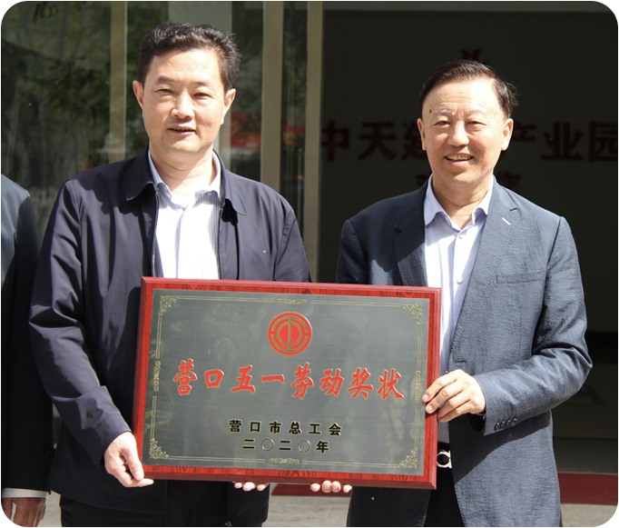 5月14日上午,營(yíng)口市西市區(qū)委副書記、區(qū)政府區(qū)長(zhǎng)王殿豐;區(qū)委常委、組織部長(zhǎng)冷震;區(qū)委常委、統(tǒng)戰(zhàn)部長(zhǎng)蔣小蘭;區(qū)總工會(huì)主席張相勝等領(lǐng)導(dǎo)在中天建筑產(chǎn)業(yè)園向中天集團(tuán)授予“營(yíng)口五一勞動(dòng)獎(jiǎng)狀”榮譽(yù),于寶權(quán)董事長(zhǎng)代表中天集團(tuán)授領(lǐng)獎(jiǎng)牌。