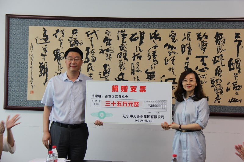捐贈(zèng)儀式上,中天集團(tuán)向西市區(qū)慈善總會(huì)捐款35萬(wàn)元,用于西市區(qū)教育事業(yè),體現(xiàn)了中天集團(tuán)心系教育的高尚情懷和強(qiáng)烈的社會(huì)責(zé)任感,是對(duì)西市區(qū)教育事業(yè)莫大的關(guān)心、支持和鼓舞?,F(xiàn)場(chǎng)于洪波總裁將支票遞交給管尊旭副書(shū)記。慈善總會(huì)劉麗華會(huì)長(zhǎng)向于總頒發(fā)了捐贈(zèng)證書(shū)。