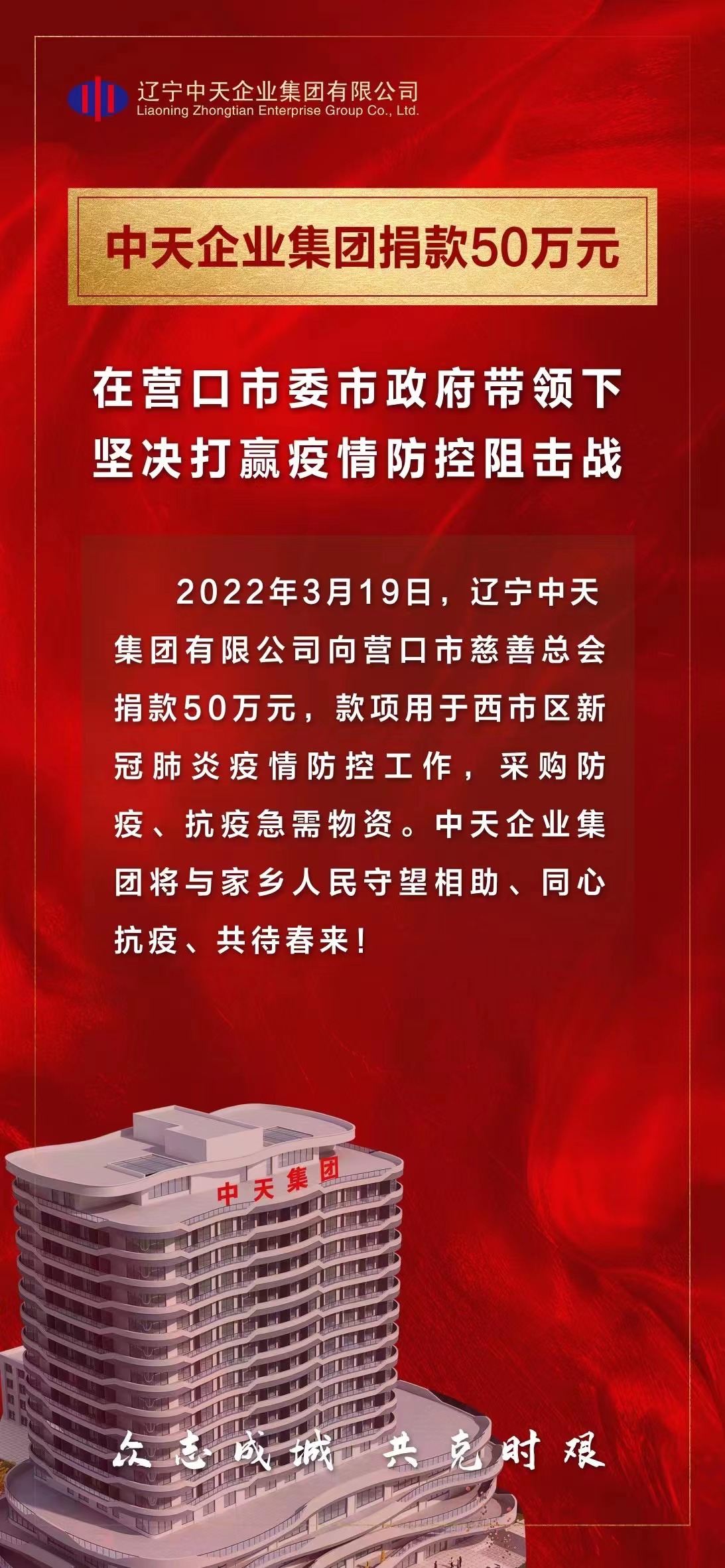 2022年3月19日,遼寧中天集團有限公司向營口市慈善總會捐款50萬元,款項用于西市區(qū)新冠肺炎疫情防控工作,采購防疫、抗疫急需物資。中天企業(yè)集團將與家鄉(xiāng)人民守望相助、同心抗疫、共待春來!