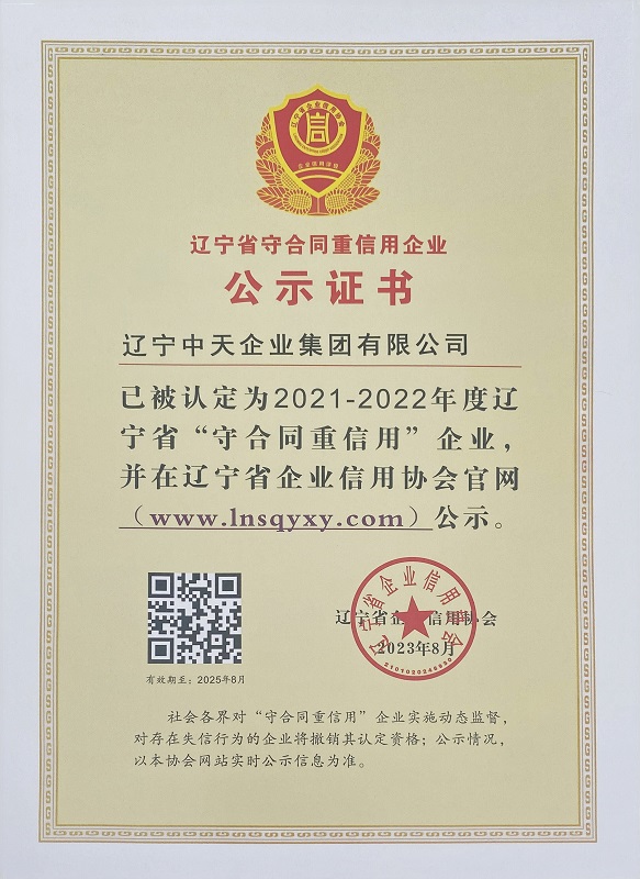 2023年8月,集團被遼寧省企業(yè)信用協(xié)會認(rèn)定為2021-2022年度遼寧省“守合同重信用”企業(yè)和信用等級5A級企業(yè),這是中天企業(yè)集團自2005年以來,連續(xù)第19年獲此殊榮,既是對我們過去經(jīng)營中取得成績的肯定,也是對我們今后經(jīng)營和發(fā)展中所給予的希望和所提出的要求。中天企業(yè)集團成立至今,始終以“誠信為本,服務(wù)至上”為經(jīng)營理念,在企業(yè)發(fā)展中,將誠信貫穿經(jīng)營以及對客戶服務(wù)的全過程,把誠信作為企業(yè)的創(chuàng)業(yè)之本,立業(yè)之基。未來,我們將矢志不渝的堅持用誠信打動客戶,以誠信塑造品牌,打造誠信企業(yè)品牌。