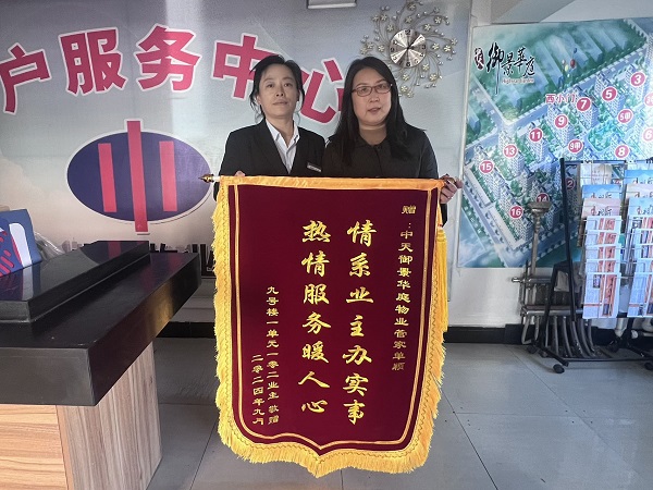 “你們對我母親太關(guān)心了太照顧了,真心感謝你們!”10月15日下午,御景華庭9號樓1單元102的業(yè)主郭女士手持著一面印著“情系業(yè)主辦實事,熱情服務(wù)暖人心”的錦旗,滿懷謝意的走進(jìn)了御景華庭物業(yè)服務(wù)中心。感謝物業(yè)人員平日里對家中母親的熱情服務(wù)和悉心照顧。