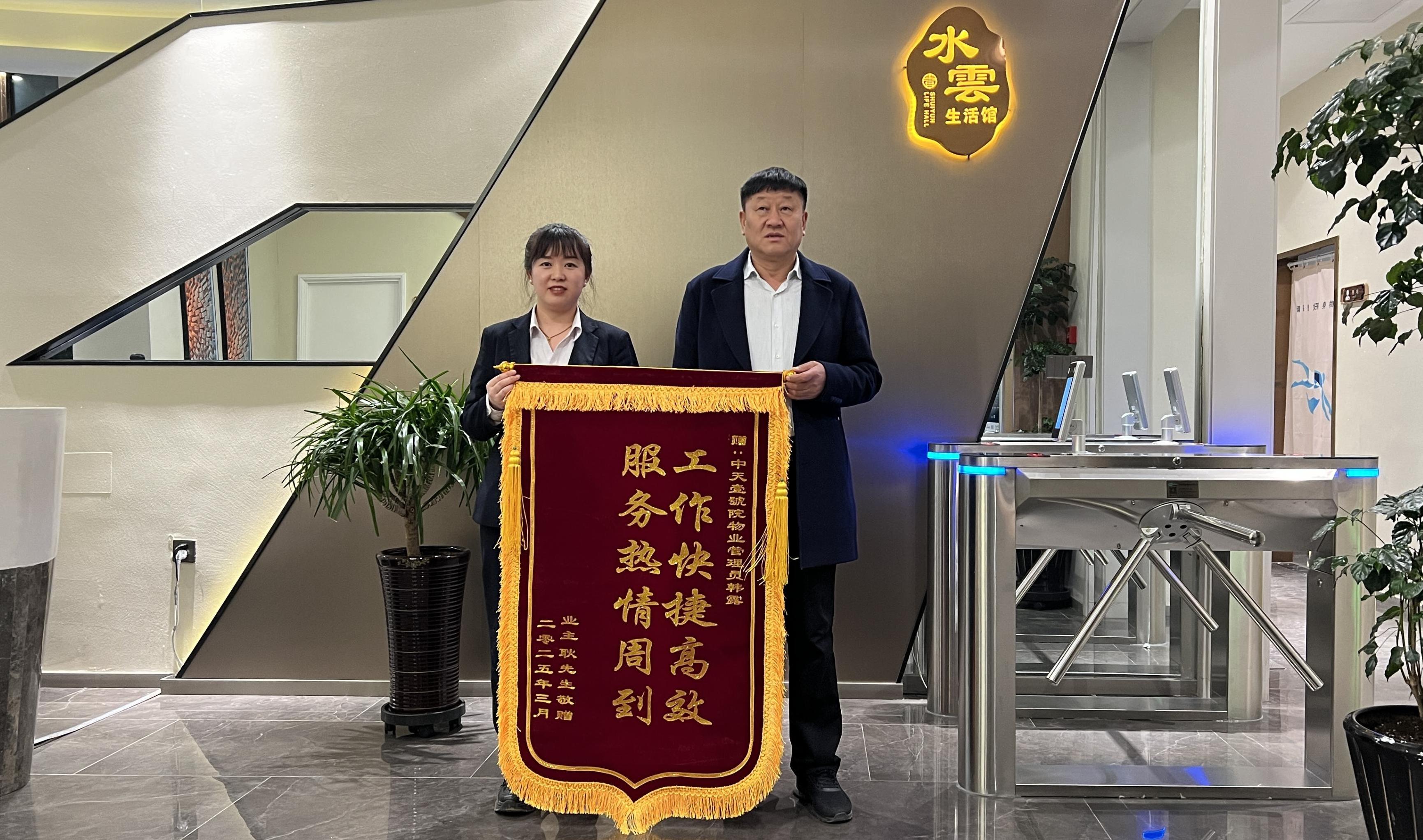 每一面錦旗背后,都有一個暖心的故事,都閃耀出一份真情和愛心。近日,中天壹號院水雲(yún)生活館的管理員就收到了一面充滿謝意的錦旗。就在上周,業(yè)主帶著外地來的朋友到會館休閑放松。朋友對會館的設(shè)施很感興趣,前臺的工作人員不僅耐心細(xì)致地為他們介紹了各個區(qū)域的功能,還根據(jù)他們的需求提供了游玩建議,讓朋友贊不絕口。在游玩過程中,業(yè)主朋友落下了自己的圍巾,前臺的工作人員發(fā)現(xiàn)后,第一時間聯(lián)系了業(yè)主,但業(yè)主表示今天沒有時間取回,可能要改天再來。我們的工作人員將圍巾收好并妥善保管直到業(yè)主取回。平日里,無論何時進(jìn)入會館,總能看到看到她面帶微笑,熱情地打招呼,辦理各項業(yè)務(wù)既高效又準(zhǔn)確。遇到業(yè)主咨詢問題,也總是不厭其煩地解答,還會主動提供幫助,讓每一位業(yè)主都感受到了家一般的溫暖。