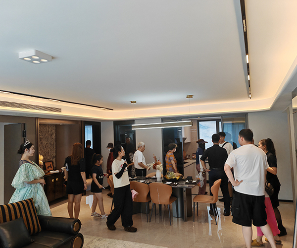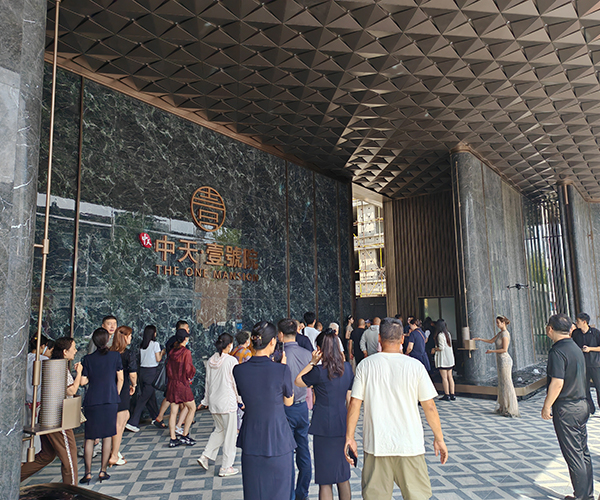 儀式現(xiàn)場,熱情高漲的客戶早已匯聚于這座流光溢彩的東大門前。以名貴理石精工筑就、星空頂熠熠生輝、水幕墻靈動瀉玉、噴泉水系恭迎貴賓的“星幕尊邸門”,其本身即是歸家尊崇儀式的開篇序章,成為令人矚目的視覺地標(biāo)。人群中,既有開盤即購房的業(yè)主,滿懷憧憬前來借鑒設(shè)計靈感,為未來愛家描繪藍圖;亦有眾多意向濃厚的準(zhǔn)業(yè)主,翹首以盼親身體驗升級品質(zhì),為理想生活尋覓最契合的空間載體。
