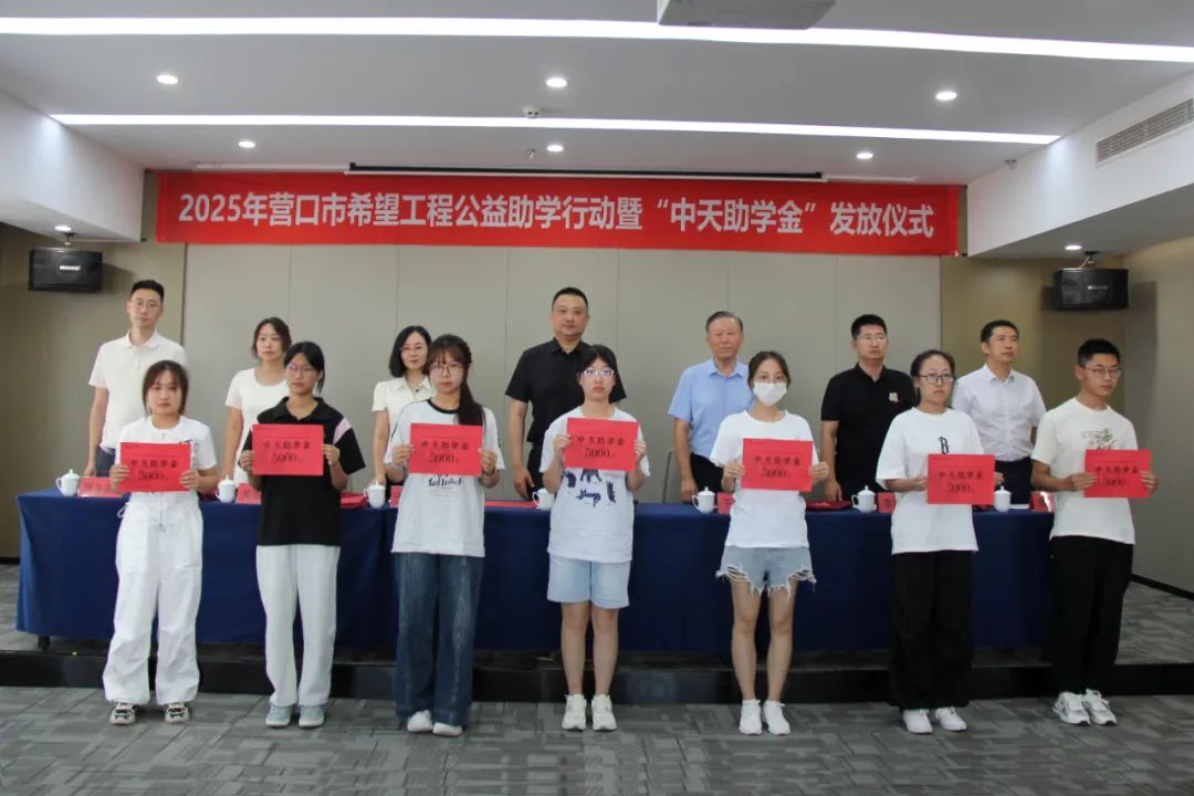 8月18日下午,2025年營口市希望工程公益助學行動暨“中天助學金”發(fā)放儀式在中天集團總部會議室舉行。營口市團市委書記劉慶男,中天企業(yè)集團董事長于寶權(quán)、總裁于洪波,營口市團市委副書記李瀚霖、曹午陽,營口市教育局副局長關(guān)雪嬌,營口市慈善總會副會長黃渤以及獲得資助的35名學生,出席了本次發(fā)放儀式。