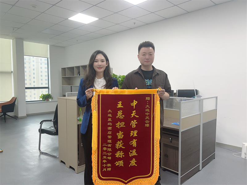 2025年10月9日,位于大連開(kāi)發(fā)區(qū)核心商務(wù)區(qū)的中天云璟寫(xiě)字樓內(nèi)洋溢著暖意與謝意。25層租戶大連星嶼酒店管理有限公司負(fù)責(zé)人一行,將一面印有“中天管理有溫度,王總擔(dān)當(dāng)獲稱頌”金色大字的鮮紅錦旗,鄭重贈(zèng)予寫(xiě)字樓負(fù)責(zé)人王總。