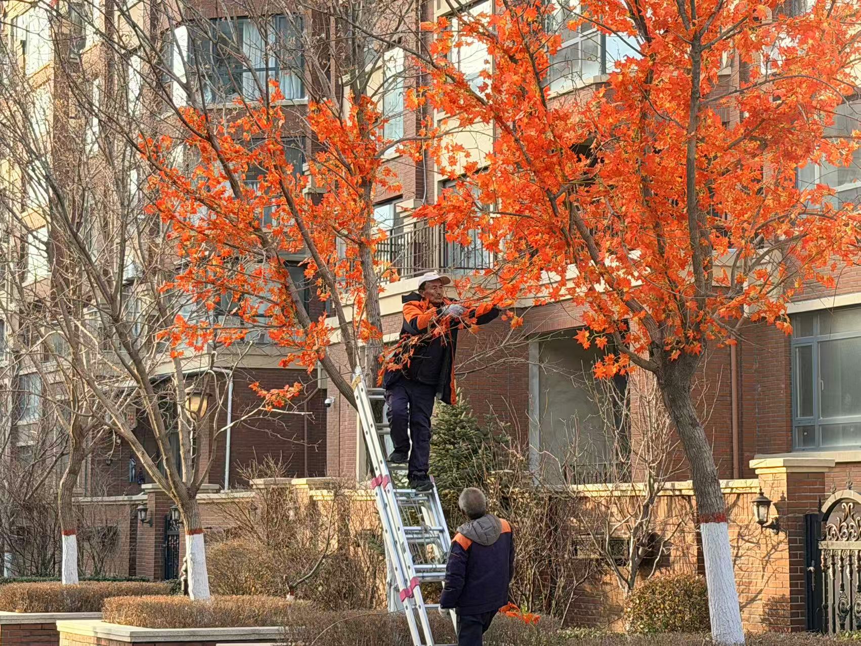物業(yè)工作人員化身“冬日魔法師”,借助梯子登上枝頭,將鮮亮的人造楓葉精心懸掛。原本在寒風(fēng)中略顯蕭索的園區(qū),因這抹抹火紅,瞬間暖意融融?;鸺t葉片在枝頭輕輕搖曳,與小區(qū)英倫風(fēng)格建筑相互映襯,仿佛把秋日的絢爛“定格”,打破了季節(jié)的單調(diào),讓寒冬有了別樣生機(jī)。