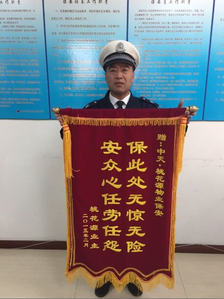 日前,業(yè)主為了感謝周班長等保安這種負(fù)責(zé)精神,特意制作了一面錦旗,上書:“保此處無驚無險,安眾心任勞任怨?!狈Q贊桃花源物業(yè)人員的高尚品德。高品質(zhì)服務(wù),送來錦旗一面,醒目的兩行字這是對我物業(yè)的工作給予的高度的肯定。