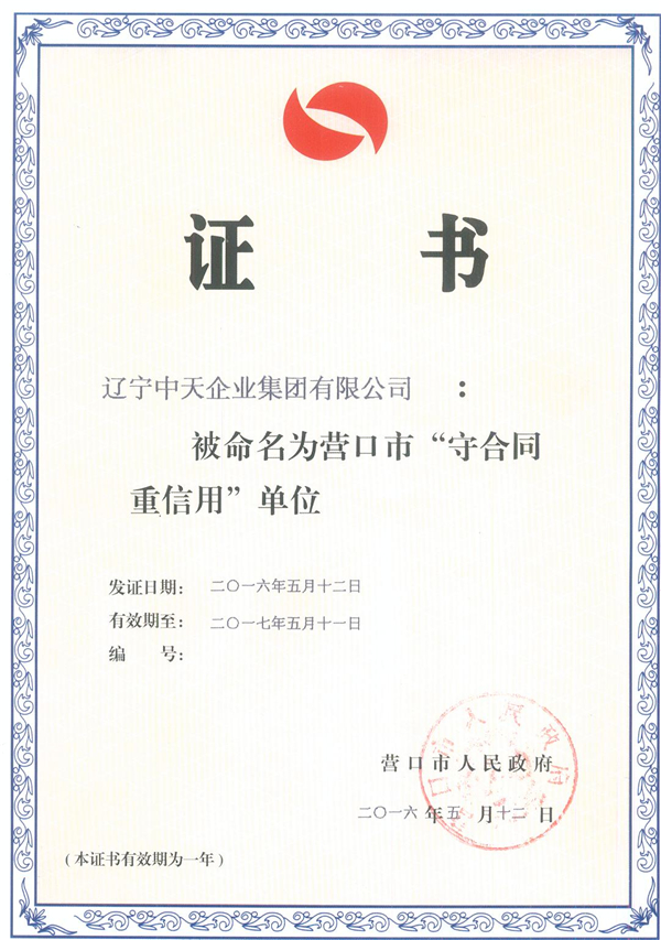 10、集團(tuán)連續(xù)12載榮獲“守合同重信用”單位稱號(hào)。2016年中天集團(tuán)再次被營(yíng)口市人民政府授予“守合同重信用”單位稱號(hào),連續(xù)12年獲此殊榮,不僅是全體員工多年勤奮工作、共同努力的結(jié)果,更是集團(tuán)恪守誠(chéng)信、規(guī)范經(jīng)營(yíng)的有力印證,也是對(duì)中天優(yōu)秀品牌信譽(yù)建設(shè)成果的充分肯定。